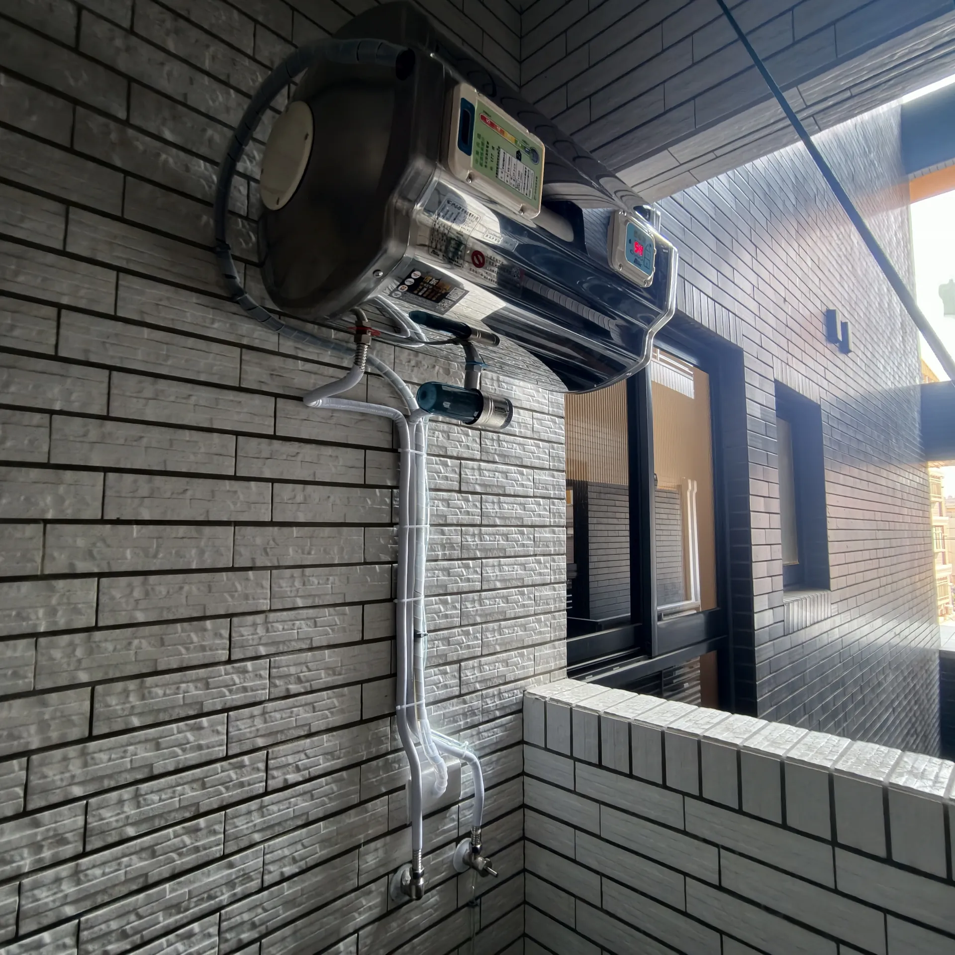 信誠建議採用怡心牌 ES1026H 橫式電熱水器,橫向設計可高掛於牆面頂部,下方完全淨空;並於進水端搭配除垢濾心,過濾水中雜質、避免水垢,延長機體壽命。完工後屋主滿意「空間變大了」,陽台不再擁擠。