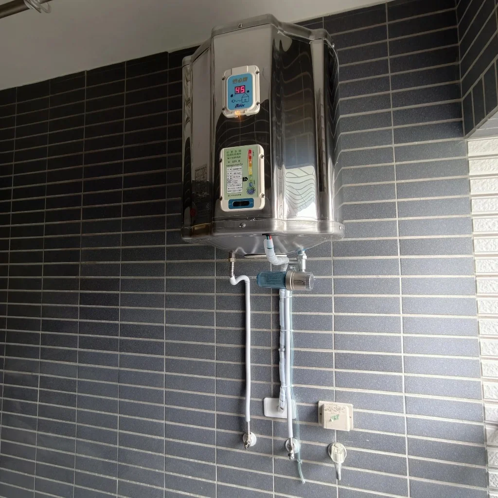 ▲ 怡心牌 ES-1426 安裝完成,二級能效、除水垢濾心、管線整齊。