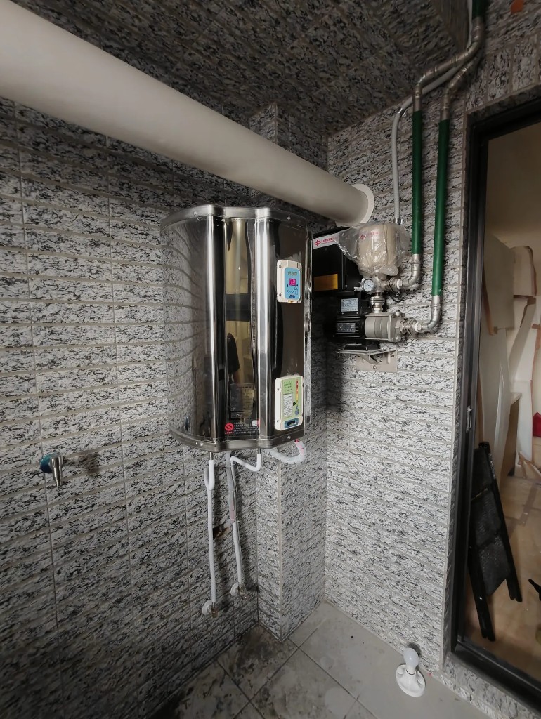 經信誠到府評估,建議安裝怡心牌 ES1826 儲熱式電熱水器,並搭配加壓馬達。ES1826 容量足夠兩間浴室同時淋浴;加壓馬達則確保高樓層或管線較長時仍能維持穩定出水。設備安裝於灰色磁磚設備間,管線配置整齊、方便日後維修,新成屋大樓兩間浴室熱水供應實例。