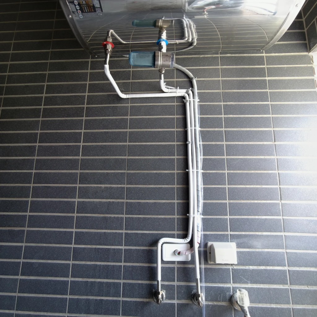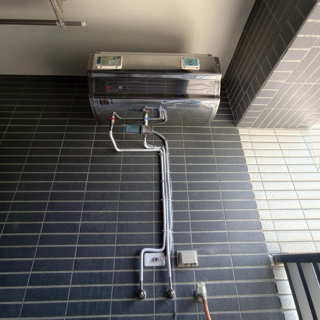 屋主習慣泡澡,家中兩間浴室,擔心同時淋浴會不夠熱。我們建議怡心牌橫式 ES2226H(86L 大容量),高掛安裝把機體往上收,並加裝海爾 T5 除垢濾心保護內胆與管路。