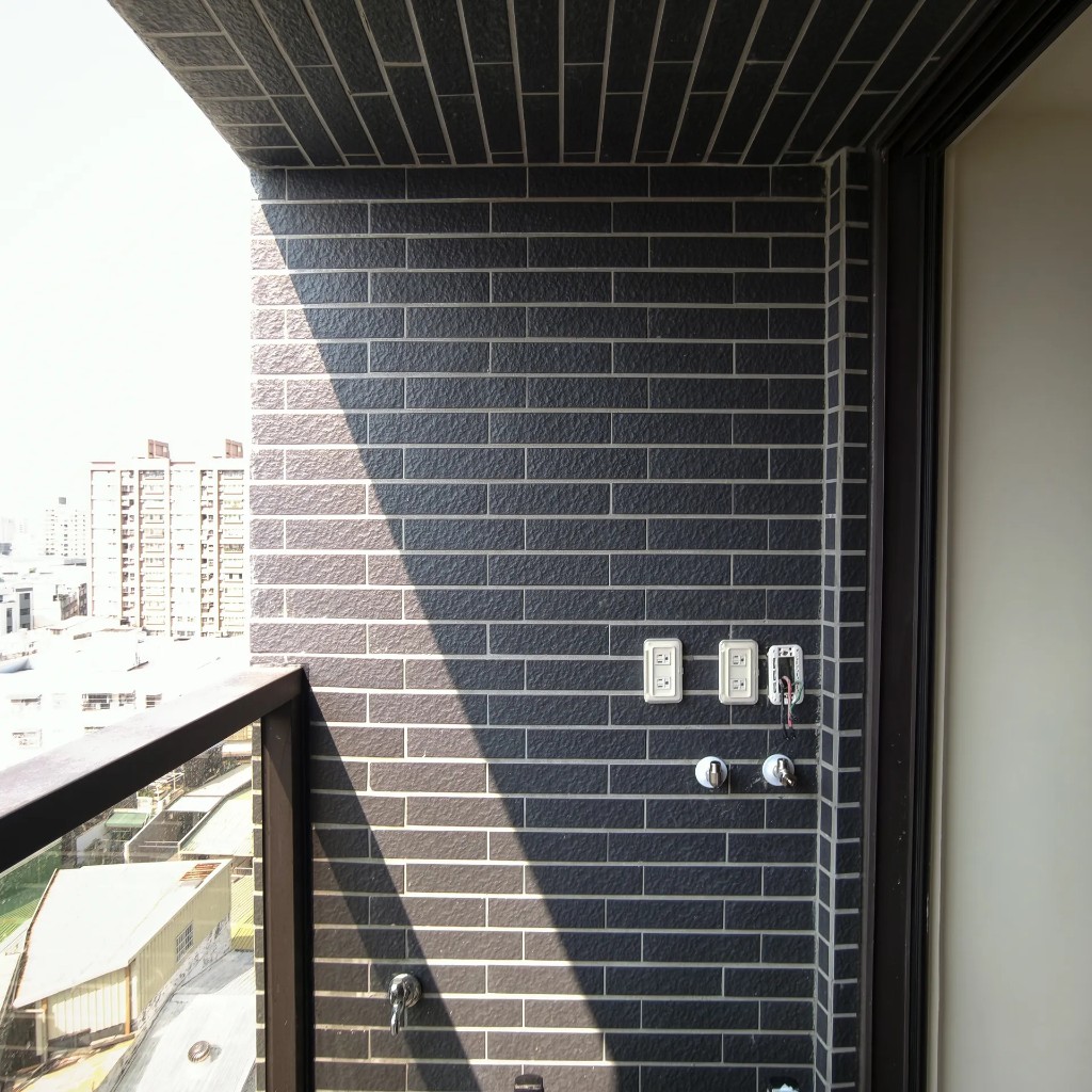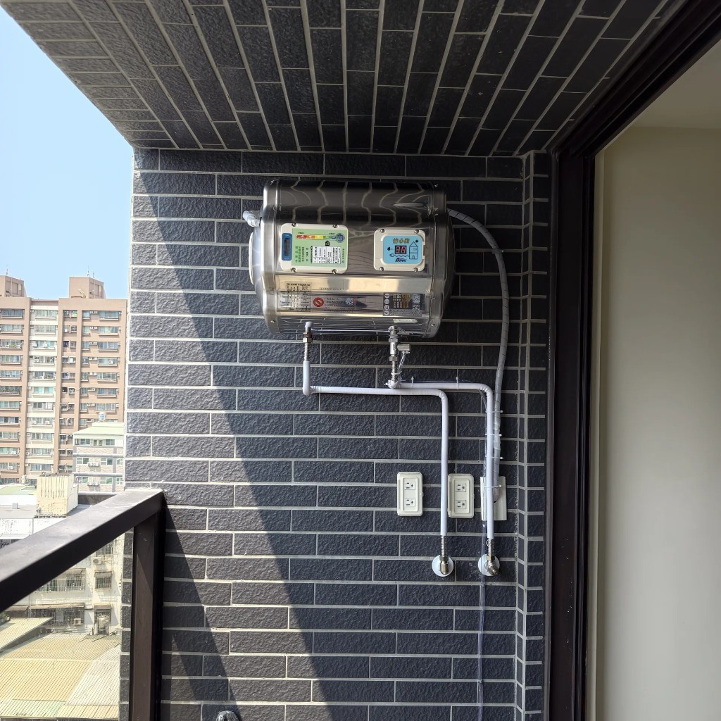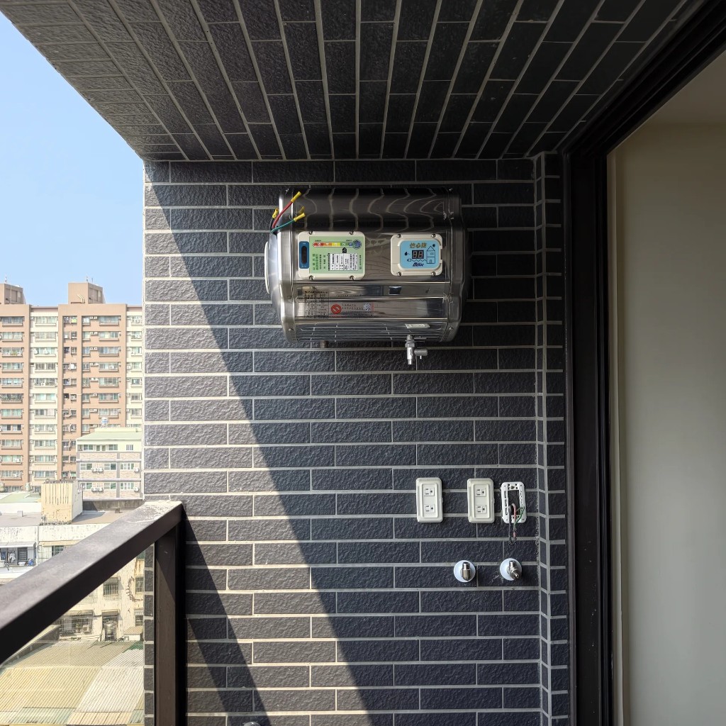 本案位於高雄市前鎮區瑞隆路、瑞隆松下建案。住戶希望陽台保留下方空間,因此選用怡心牌 ES626H 橫掛式電熱水器,並將機體盡量靠上固定,讓走道與晾曬動線更寬敞。