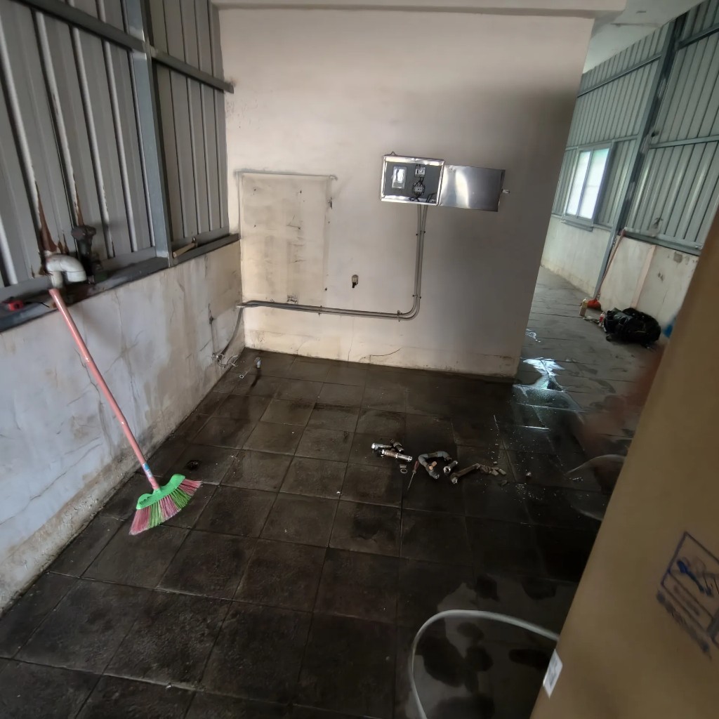 舊機移出後,牆面可見長方形置機痕跡,地面留有廢管件、接頭與施工屑。我們先掃除金屬碎屑與泥沙,再以清水刷洗磁磚地坪,避免異物傷及新機烤漆與保溫材外包覆。
