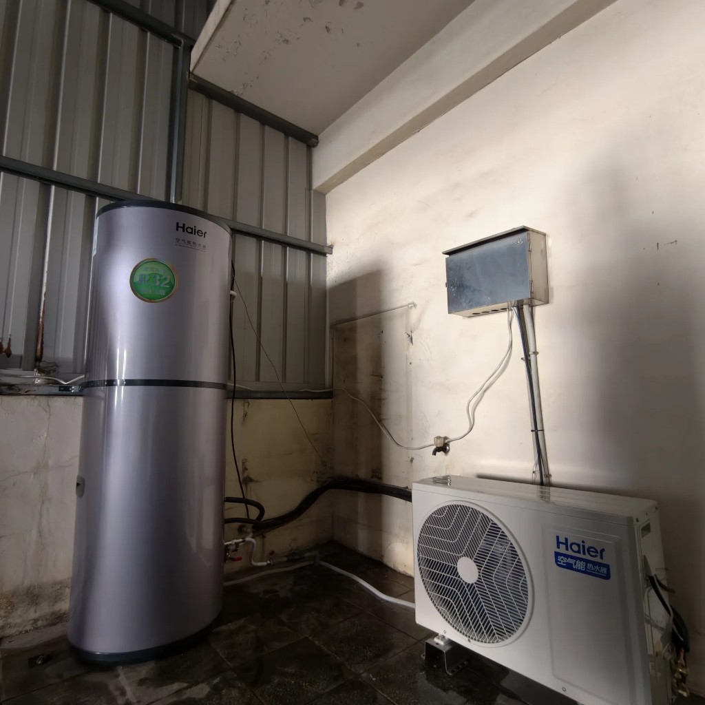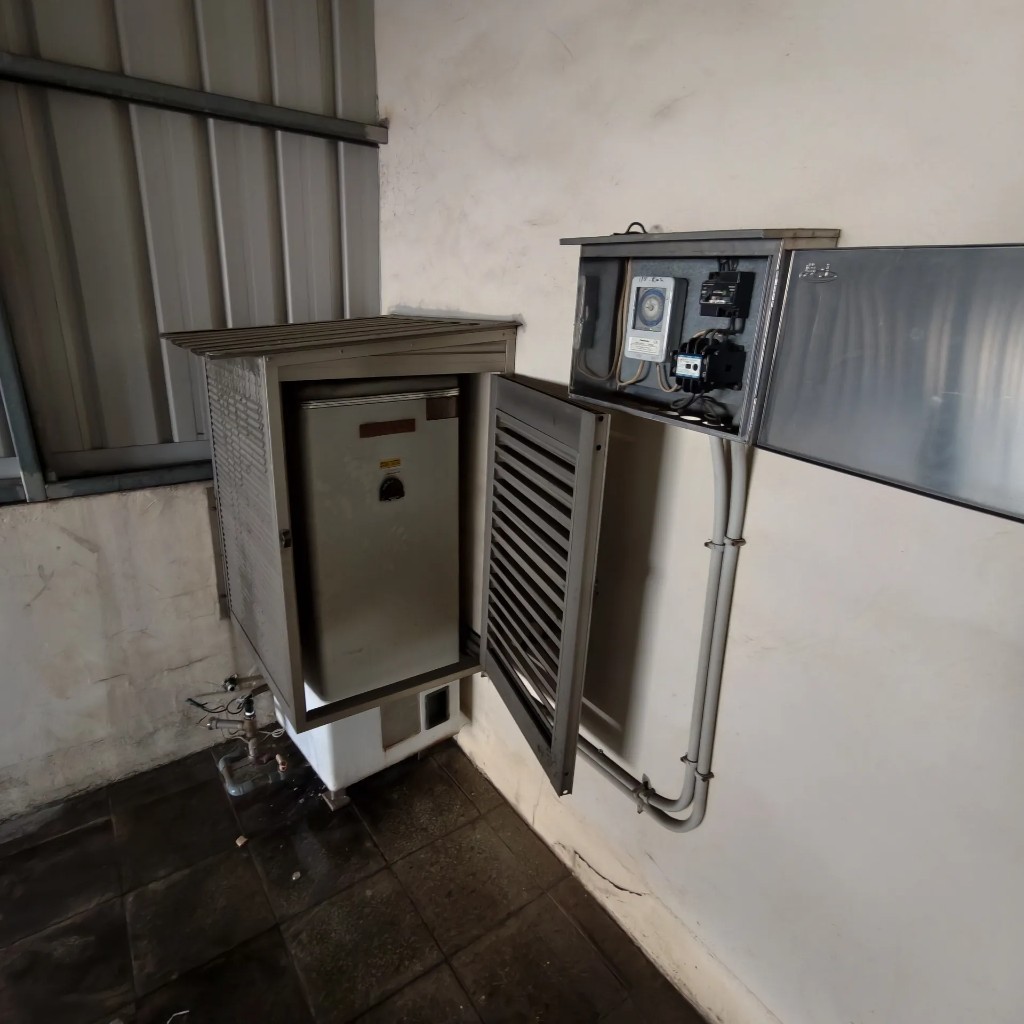 本案為住商混合街廓一側的設備空間,屋主希望以大水量、長期省電取代舊式儲熱設備。評估通風與排水條件後,採用 海爾新一代變頻空氣能熱泵熱水器 TS7-300L(型號 HP50W/300TS7),以下依工序說明現場狀況與施工重點。