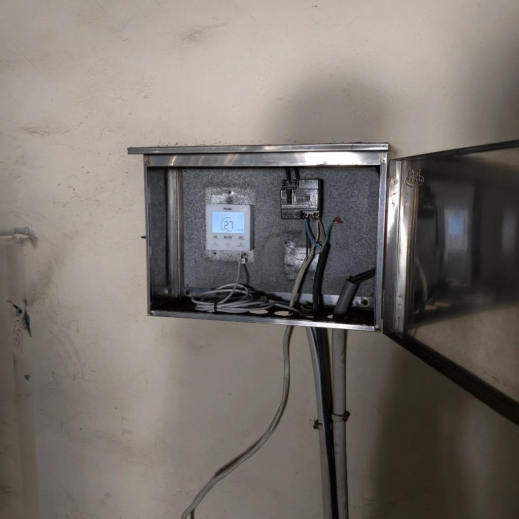 本機線控面板為海爾數位控制器,安裝於不鏽鋼防護箱內,同箱配置無熔絲開關/斷路器與整齊配線,適合半戶外環境防潑水與防蟲塵。上電後螢幕可讀取水溫與運轉狀態(照片中顯示約 27℃),再依屋主習慣調整設定溫度、模式與定時。