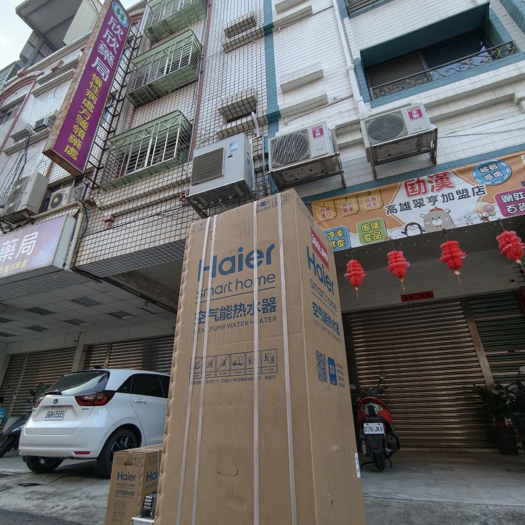 機組於日間送達臨路店面/樓上住家動線旁,外箱標示 Haier Smart Home、HEAT PUMP WATER HEATER 與 300L,可確認容量與機種類型。周邊為典型高雄街區立面,利於吊卸與搬運路徑規劃;送達後先確認外箱完整、配件箱齊全,再與屋主約定進場時間。
