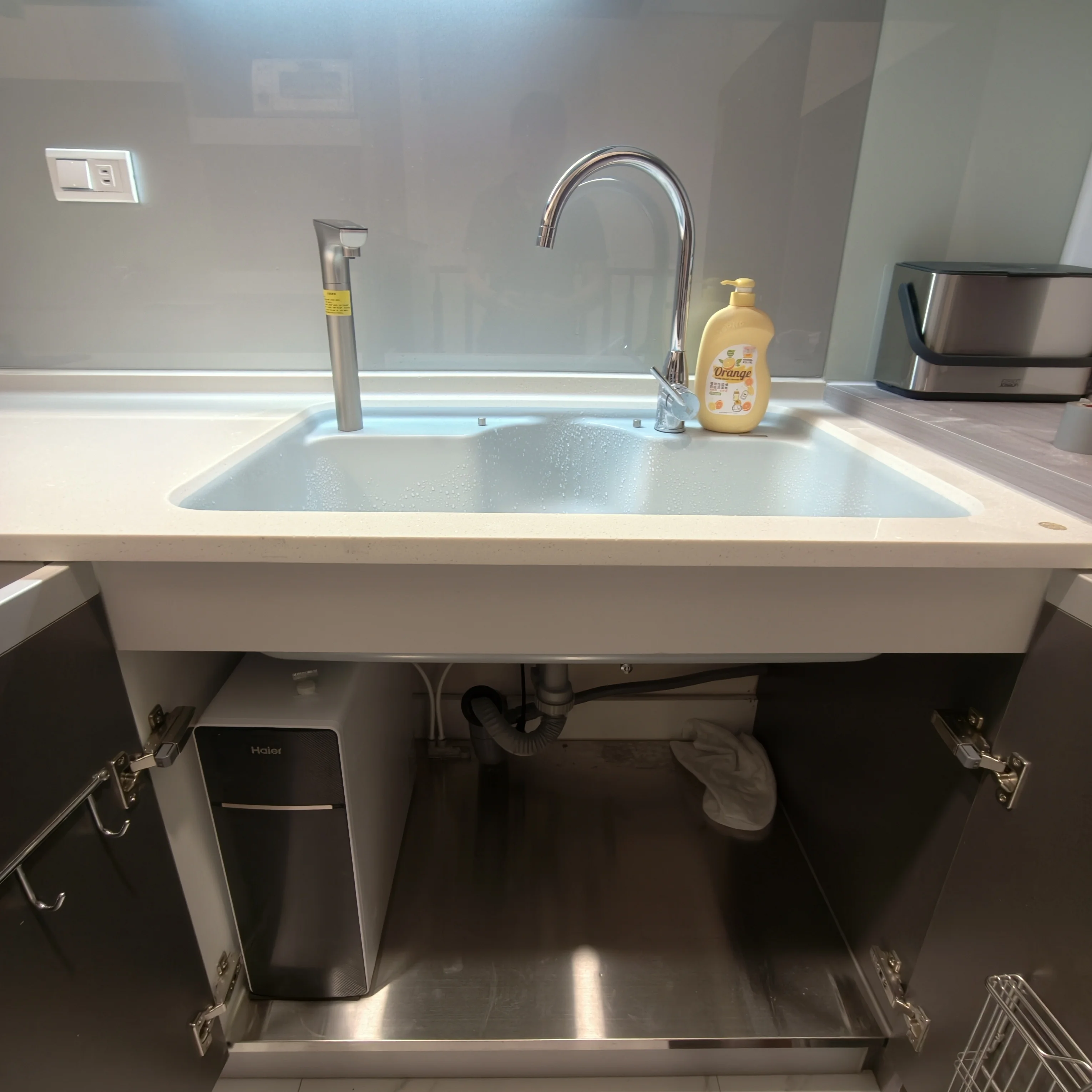 綜合廚房空間、水槽配置與用水習慣,信誠店長建議安裝海爾 RO 四段溫控廚下淨水器。主機安裝在水槽下櫥櫃內,檯面只需要一支淨水龍頭即可,視覺乾淨俐落;透過四段溫控設計,可依需求出常溫或溫熱水,平常喝水、泡茶、沖咖啡都方便。完工如圖,櫥櫃內管線整理妥當,日後維修與換濾心也好操作。